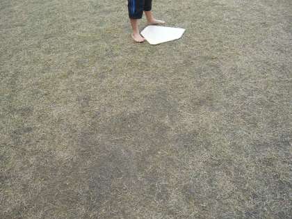ホームベースが、ずいぶん芝生の内側に移動してきました。