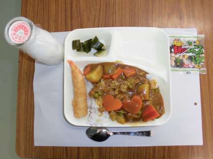 今日は「えびフライカレーライス(米粉使用)、きゅうりのピクルス、豆こんぶ、牛乳」です。米粉は「食物アレルギー対応サポート月間」として、カレールウの素は米の粉を原料とし、小麦粉は使用していません。また、給食調理員さんがハート型の人参を入れてくださいました。ボリュウムがあり食べ応えがありました。