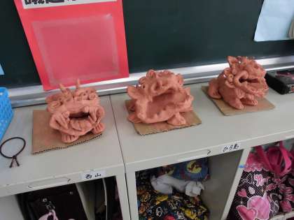 4年生が図工科の学習で「シーサー」を作りました。赤土の色をした粘土を使いました。本日は外部より特別講師をお招きし、最初から作り方を教えていただきました。顔の部分と胴体の部分を別々に作り合わせていきました。粘土は乾いてしまうので、一気に作り上げました。