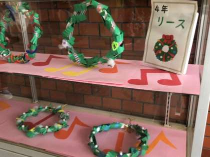 玄関掲示は12月の掲示に変わり、作品ケースでは4年生制作のリースがお出迎えします。