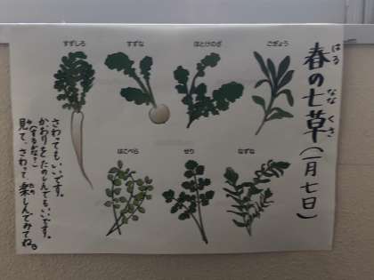 今日の1月7日は、学校にとって新しい年のスタートですが、1月7日は「七草の日」とも呼ばれています。昔から、1月7日に春の七草(せり、なずな、ごぎょう、はこべら、ほとけのざ、すずな、すずしろ)の入った粥を食べる習慣があります。普段食べることが少ない春の七草ですが、この時期は見かけることも多いので、ぜひ覚えておいてください。