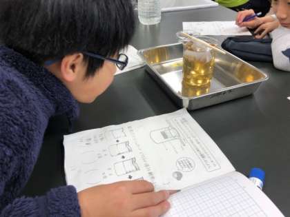 「もやもやとしたものが、下に落ちていく」「下に落ちて渦を巻くように広がっていってる」など、様々な発見をした観察でした。