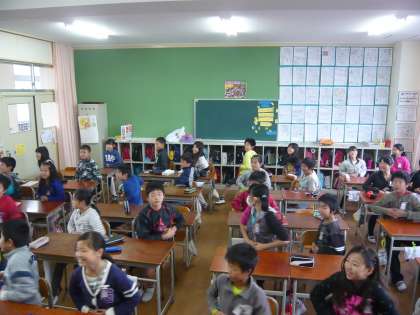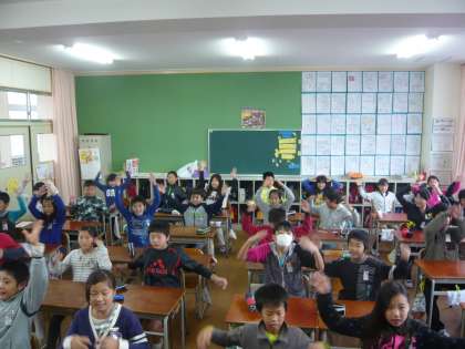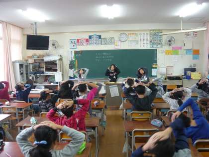 5年1組の教室でも、健康委員会の児童が前に立ち、みんなで音楽に合わせてノビノビたいそうをしました。