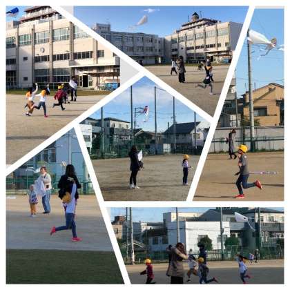 今日の土曜授業では、1年生のPTC集会を行いました。良い天気のもと、親子でたこあげを楽しんでいます。たこは子ども達の手作りです。