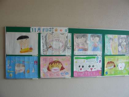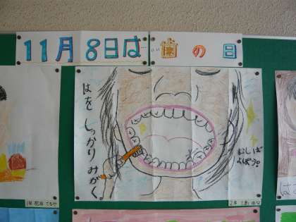 保健室横の掲示に歯と口の健康のポスターを掲示しています。