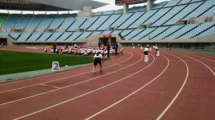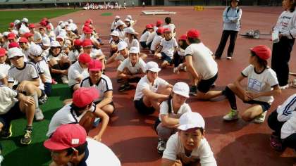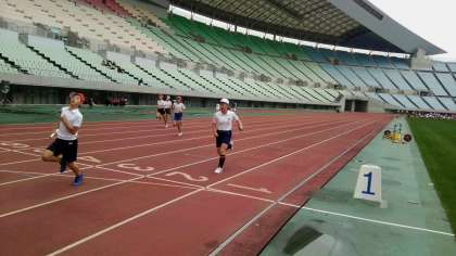 4×100メートルリレーです。競技場を4人でバトンをつなぎ、1周します。