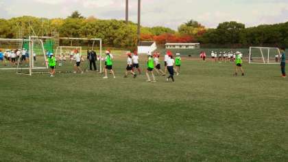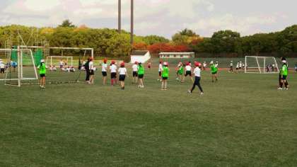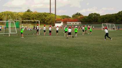 午後からは、第2陸上競技場で「サッカー」の交流試合です。一面天然芝生の上での活動は気持ちいいものです。力いっぱい蹴ってシュート!!