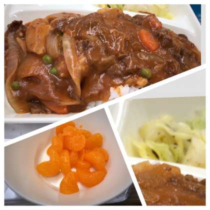 今日の給食の献立は、「ハヤシライス、キャベツのひじきドレッシング、みかん(缶詰)、牛乳」でした。