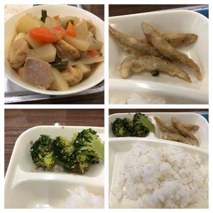 今日の給食の献立は、「きびなごのてんぷら、一口がんもとじゃがいもの煮物、ブロッコリーの胡麻和え、ごはん、牛乳」でした。