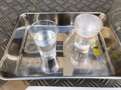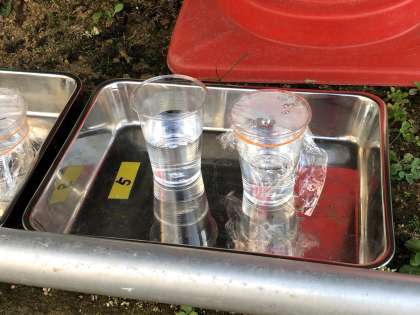 4年生が理科「水のゆくえ」の学習で、運動を使い実験をしています。「水を温めずにおいておくとどうなるのか」を確かめるために、運動場のいろいろなところに実験道具を置いています。