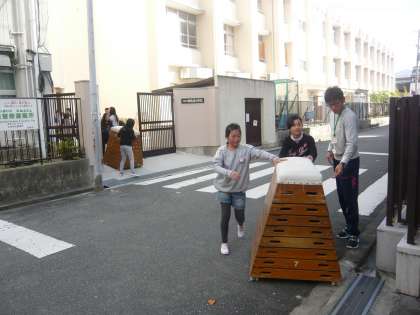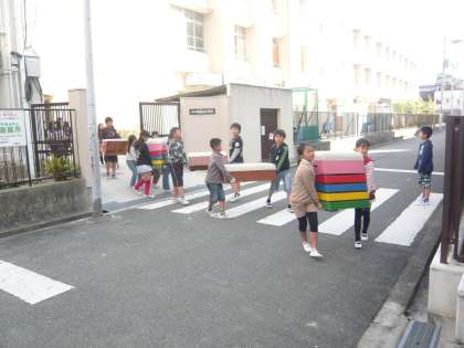 マットは、講堂棟の2階に。跳び箱類は、プール棟の1階に。