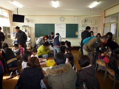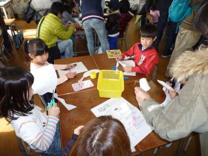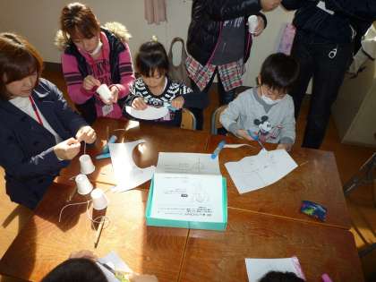 3時間目は「おもちゃを作ろう!」の活動をしました。紙コップを使い動くおもちゃを作りました。保護者の方々にも入っていただき、童心に返って作業されていました。