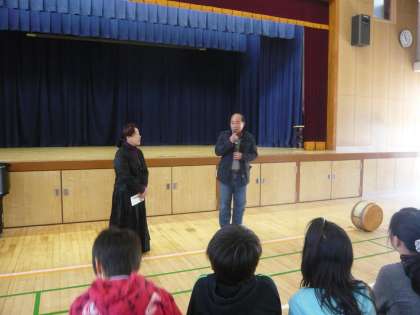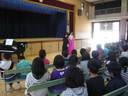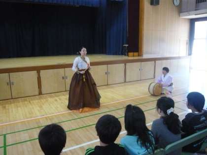 国際理解教育の一環として、韓国から今、日本に来て演奏活動をしているクンテオウル国楽団の皆様にお越しいただき、韓国の古くから伝わる音楽や歌を聴かせていただきました。