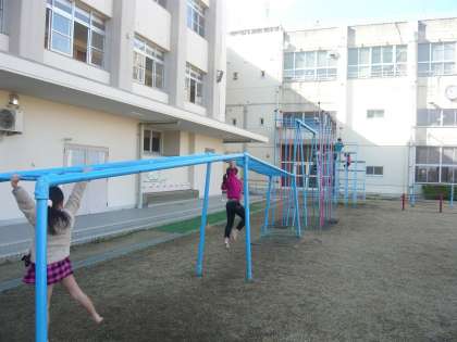 日なたでは、芝生も乾いて気持ちよさそうに鉄棒遊びをしていました。