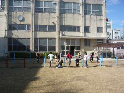 冬になると太陽の高度が低くなり、南側にある校舎の影が芝生をおおいます。