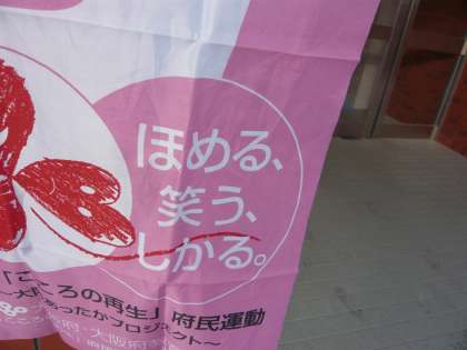 「こころの再生」府民運動ののぼりを、玄関に取り付けました。