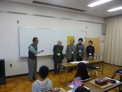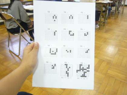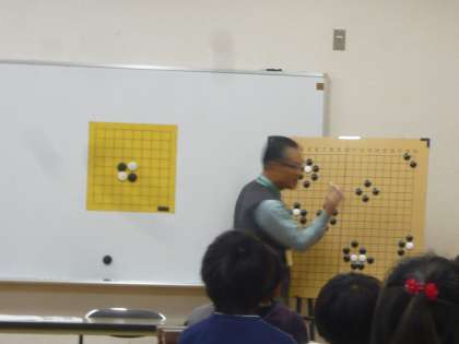 4年生の子どもたちに、囲碁を教えていただきました。大阪市コミュニティ協会生野支部協議会の方々5名の方々に来校していただき、「こども囲碁教室」を開いていただきました。囲碁は今から約1500年前に中国から伝わったとされています。年齢、性別、国境も関係なくだれでも楽しめるゲームでコミニュケーションに役立つと言われています。