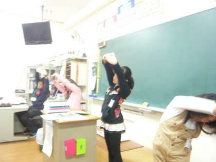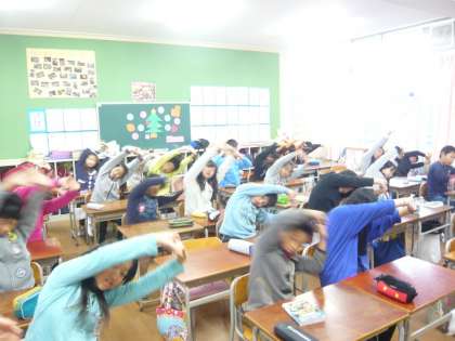 人数が多くて、教室いっぱいの5年生ですが、座ってするノビノビたいそうを気持ちよさそうに体を伸ばしながら行っていました。