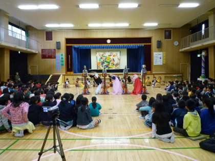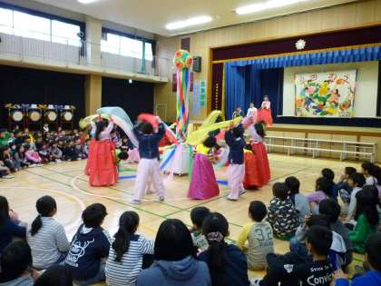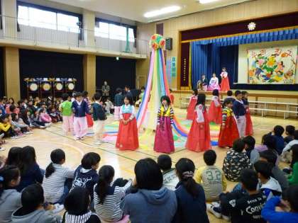 低学年の発表は「タンシンチュル(丹心柱)」を披露しました。色とりどりの布を巻いていきました。きれいに編み、心が1つになったようです。また、高学年は、「両面だいことチャンゴ、プクを華やかに演奏してくれました。