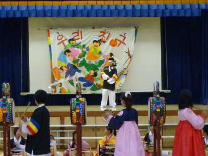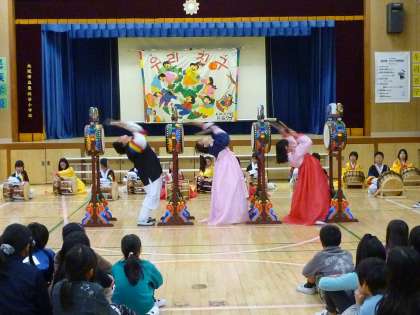 高学年では、「キンサンモ」(長い幅広リボンのついた帽子)も披露してくれました。全体に盛り上がり、観覧している子どもたちも拍手喝さいでした。練習をたくさんしたことがよく分かる内容でした。これから11年目に突入します。さらに東桃谷小の民族学級の活動が深まり続いていくことが期待されます。ご観覧の保護者の方々もありがとうございました。