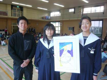 勝山中学校生徒会が、1月に改めて小学校玄関に立って受け取りに来られます。