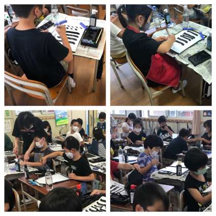 3年生の書写の学習です。今日は「横画」に挑戦しました。『トン」「スー」「トン」のリズムで、始筆と終筆に気をつけて書きました。