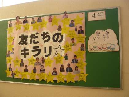 4年生は、階段の踊り場の掲示ボードに「友だちのキラリ」を掲示していました。