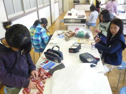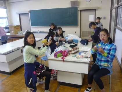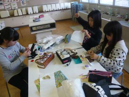 「料理や手芸にチャレンジ」は、家庭科室で手芸をしていました。小物作りでアップリケや編み物などいろいろな物を各自が工夫して作っていました。