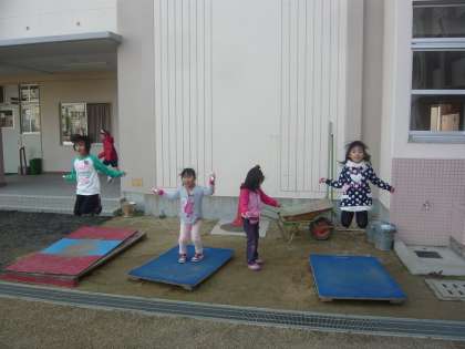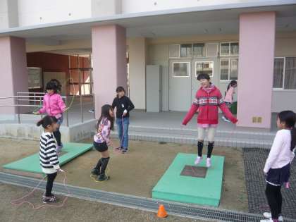 子どもたちの中で順番を守り、仲よくなわとびを楽しんでいます。