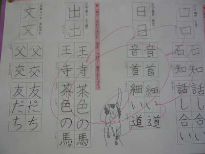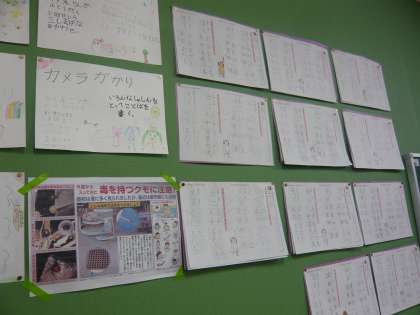 教室の掲示板には、書き方の時間に書いた書き方プリントが掲示されていました。