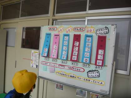 保健室前のシールです。健康な生活を送るために保健室の桂先生が様々な取り組みをしています。立ち止まってご覧ください。