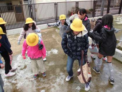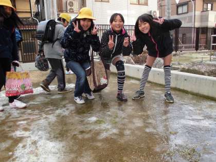 「寒い!!」の一言で済ませてしまうほどの寒さです。運動場の一角が今朝も凍っていました。