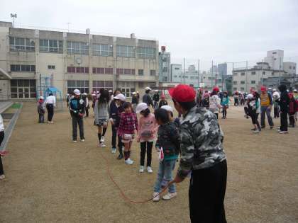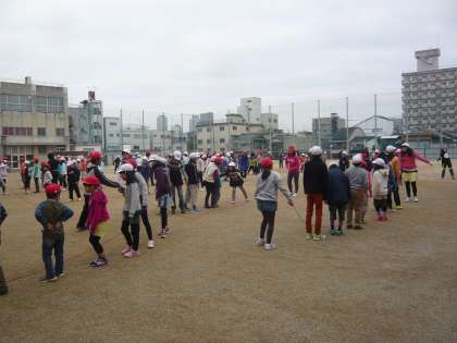 各縦割りグループに分かれて、大縄で「みんなでジャンプ」をしました。