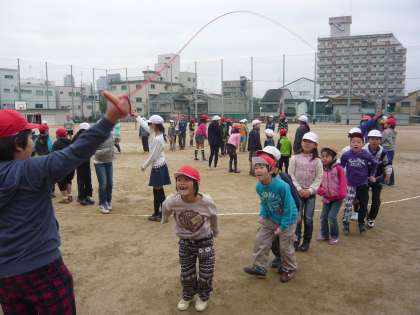 跳ぶタイミングやリズムを合わせにくい子どもに声掛けしたり、手をつないで跳んだりといろいろ工夫をしていました。