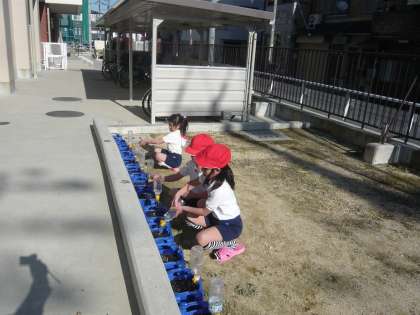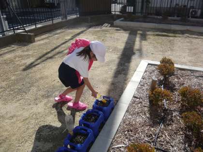寒い日が続いていますが、1年生はチューリップの球根を子ども一人が一鉢ずつ朝顔のときと同じように植えています。