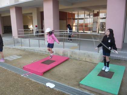 これは、三好管理作業員が、子どもたちのために古くなって傷んでいたジャンピングボードをリニューアルしたものです。すでに、黄緑色のジャンピングボード2台をリニューアルしていますが、これからもっともっと子どもたちになわとびを楽しんでもらいたいものです。