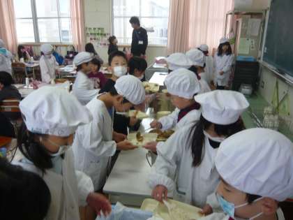 教室では、配膳をします。2年生も、素早く配膳をしていました。