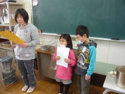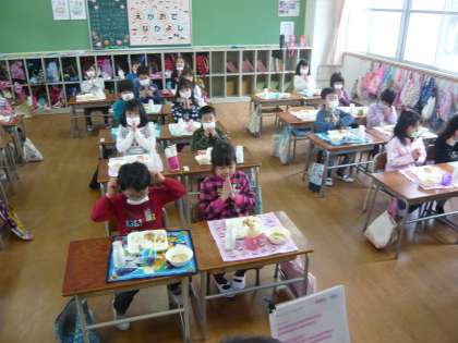 担任から、今日の給食の献立について説明し、いよいよ声をそろえて「いただきます」
