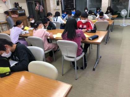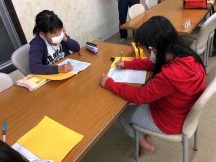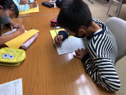 一日のふり返り時間です。今日一日の活動を思い出し、よかったところ、頑張れたところを書いています。