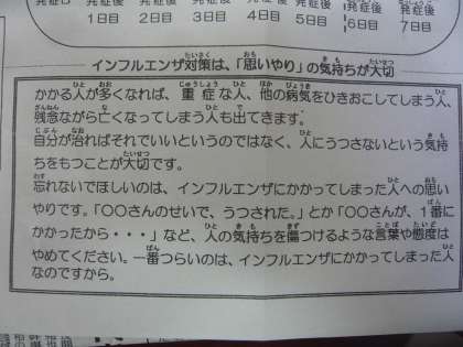 家族や学校の友達など周りの人の心遣いで、かかった本人ができるだけ早く快方に向かうようよろしくお願いいたします。