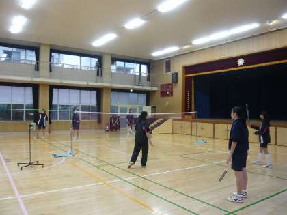 勝山中学校の体育館が天井改修工事のため使用できないので、昨日から女子バドミントンクラブが東桃谷小学校の講堂で練習をしています。