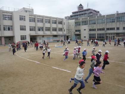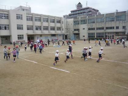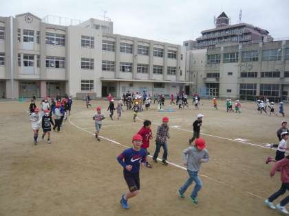 子どもたちは上着を脱いで、低学年はトラックの内側を、高学年はトラックの外側を走ります。