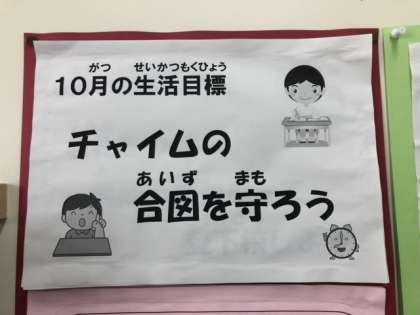 次に、担当の先生から、今月の生活目標「チャイムの合図を守ろう」の話がありました。