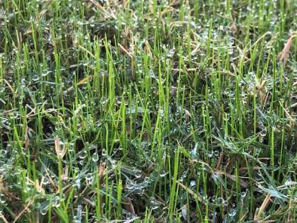 現在、養生中の芝生ですが、先週撒いた冬芝の種が芽を出し、元気に育ってきました。