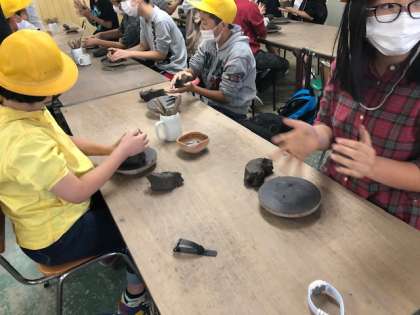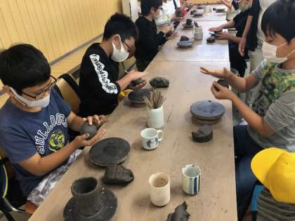 まずは粘土を2つに割って、丸く広げていきます。