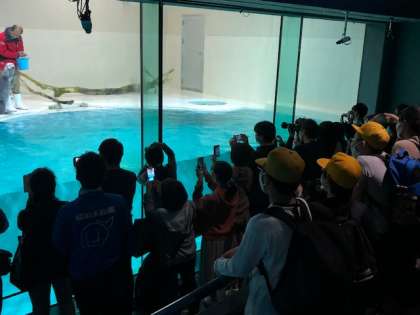 ラッコの餌やりタイムは人気コーナーで、たくさんの子どもたちが集まっていました。