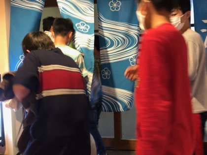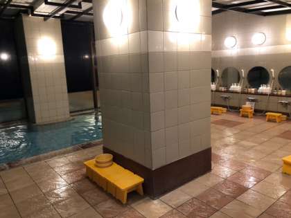 子ども達、今からお風呂に入ります。大浴場はとっても広いので、ゆっくり気持ちよく入浴することができます。