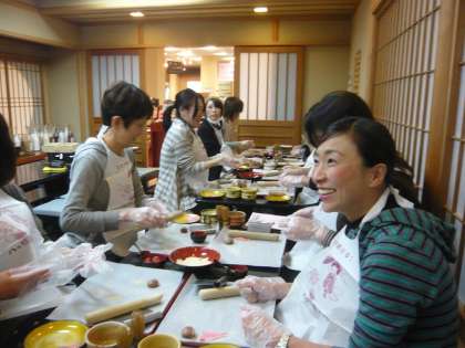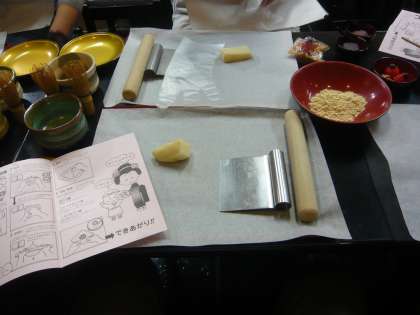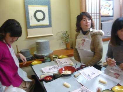 皮になるもとを二つに取り分けて、食紅やニッキを混ぜます。