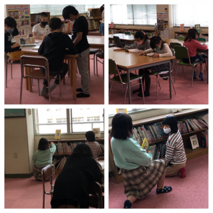 金曜日は図書館補助員の方に来ていただき、「図書館一日あいてんデー」を行っています。現在、読書週間ということもあり、たくさんの児童が図書館を利用していました。
