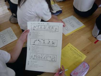 「台上前転」の技のポイントを担任の助言や技のチェックカードでつかんだ子どもたち。それぞれに自分の課題を解決する場で教えあいながら取り組んでいました。